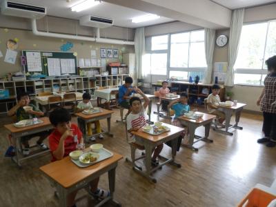 給食の様子(1・3・5年 みどり学級)です。マスクを外せるのは、給食の時間や運動している時です。給食はホッとする時間だと思います。でも、マスクを外すので、危険な時間帯でもあります。今は、黙食に心掛けています。しばらくの間は、静かにいただきましょう。次回は、2・4・6年の様子を紹介します。